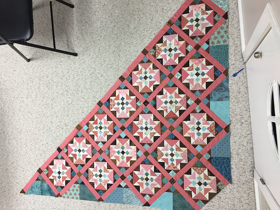This cream with little red star fabric was in my stash and perfect for a final border. Now it will have to return to the ufo bin until I have time to quilt it.