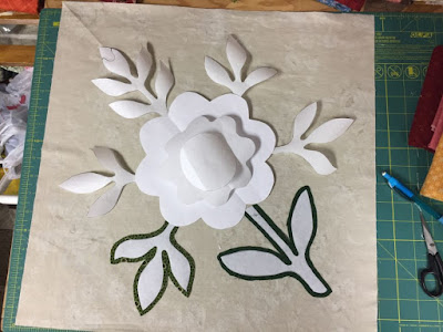 I started on the next block right away.  So far only one of 3 flowers appliqued.  I played around with the shapes a little again - I like to make some changes to make the project my own.